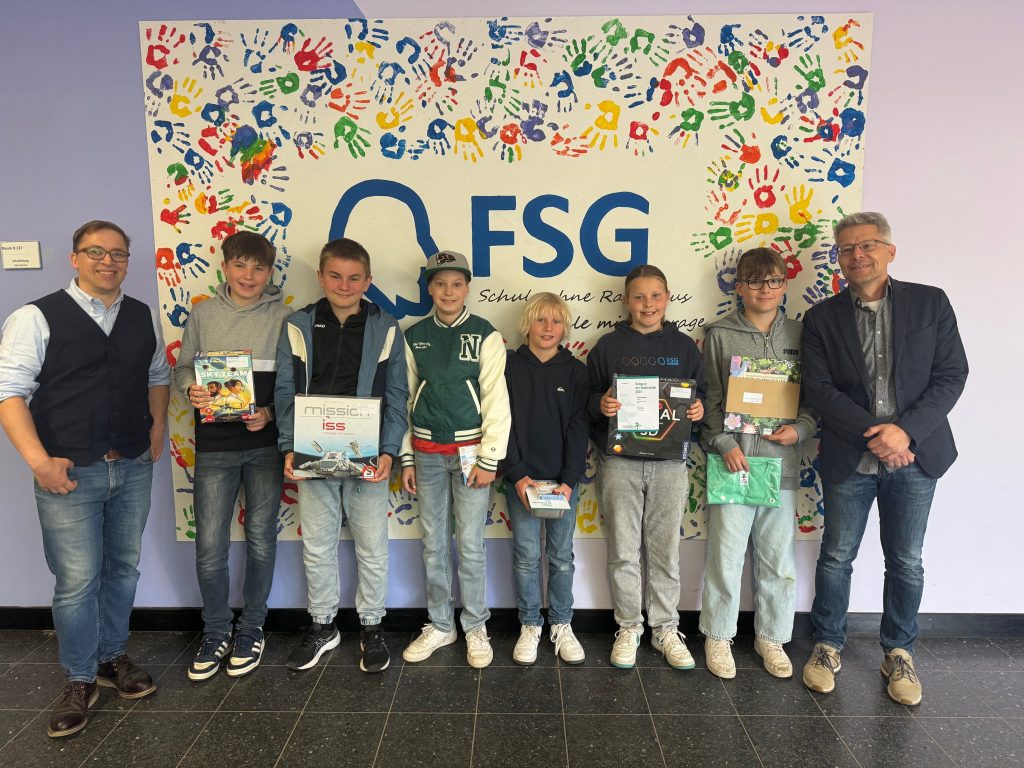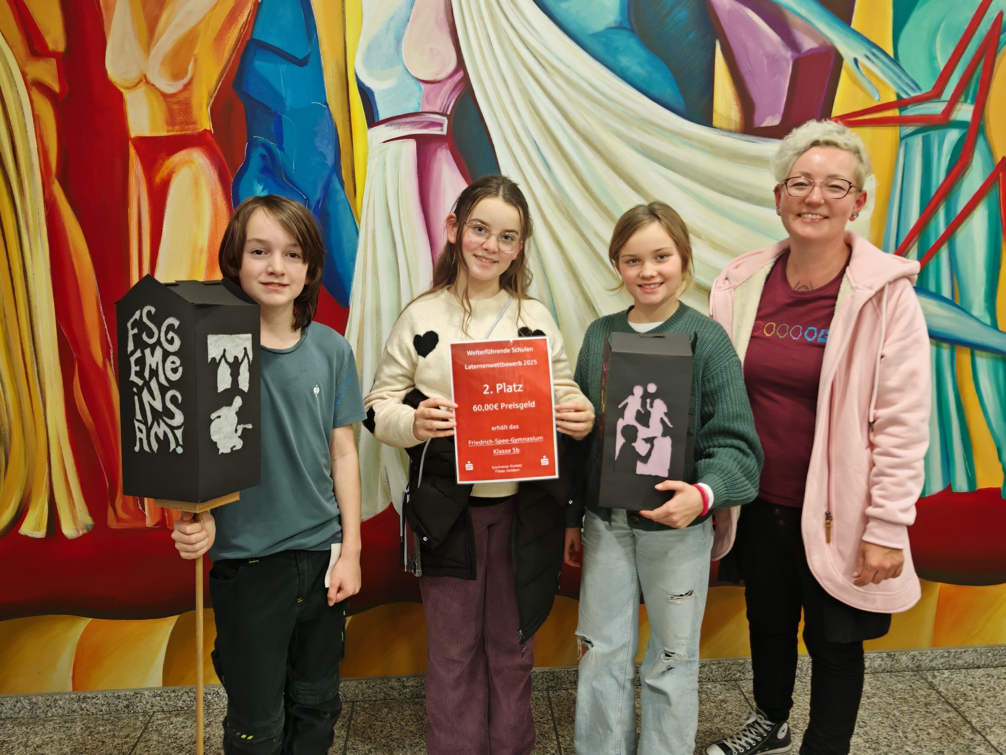 Bei der Preisverleihung waren vom FSG Tristan (5b), Hanna (5b), Frau Baus sowie Frau Claßen und ich (Lisa 5b) dabei. Unsere Laterne stellt ein Haus bzw. unsere Schule dar, da wir aktuell auf zwei verschiedene Standorte aufgeteilt sind. Auf den beiden Seiten der Laterne sind Kinder abgebildet, die z.B. Bücher lesen oder Sport treiben. Diese Laterne bastelten wir mit unseren beiden Kunstlehrerinnen Frau Dierks und Frau Baus mehrere Wochen im Kunstunterricht. Hoffentlich gewinnen wir nächstes Jahr wieder etwas.