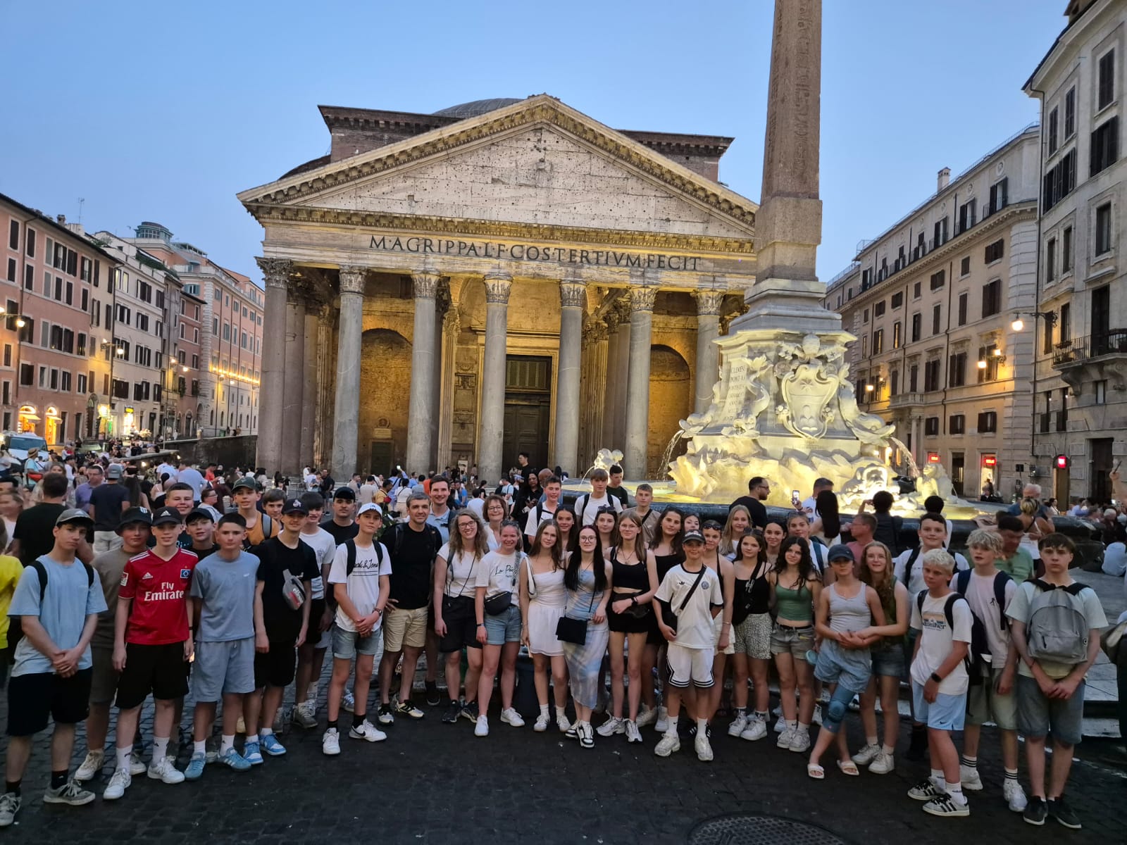 Am Abend gingen wir alle gemeinsam an der Piazza Navona essen. Unsere Lehrer hatten für uns ein Restaurant ausgesucht, in dem wir zu einem festen Preis zwischen Pizza und Nudeln wählen konnten. Danach schauten wir uns noch das Pantheon und den Trevi-Brunnen an, beides wunderschön beleuchtet bei Nacht. Begeistert von unserem ersten Eindruck von Rom, liefen wir den ganzen Weg zur Unterkunft zurück und fielen todmüde in unsere Betten.