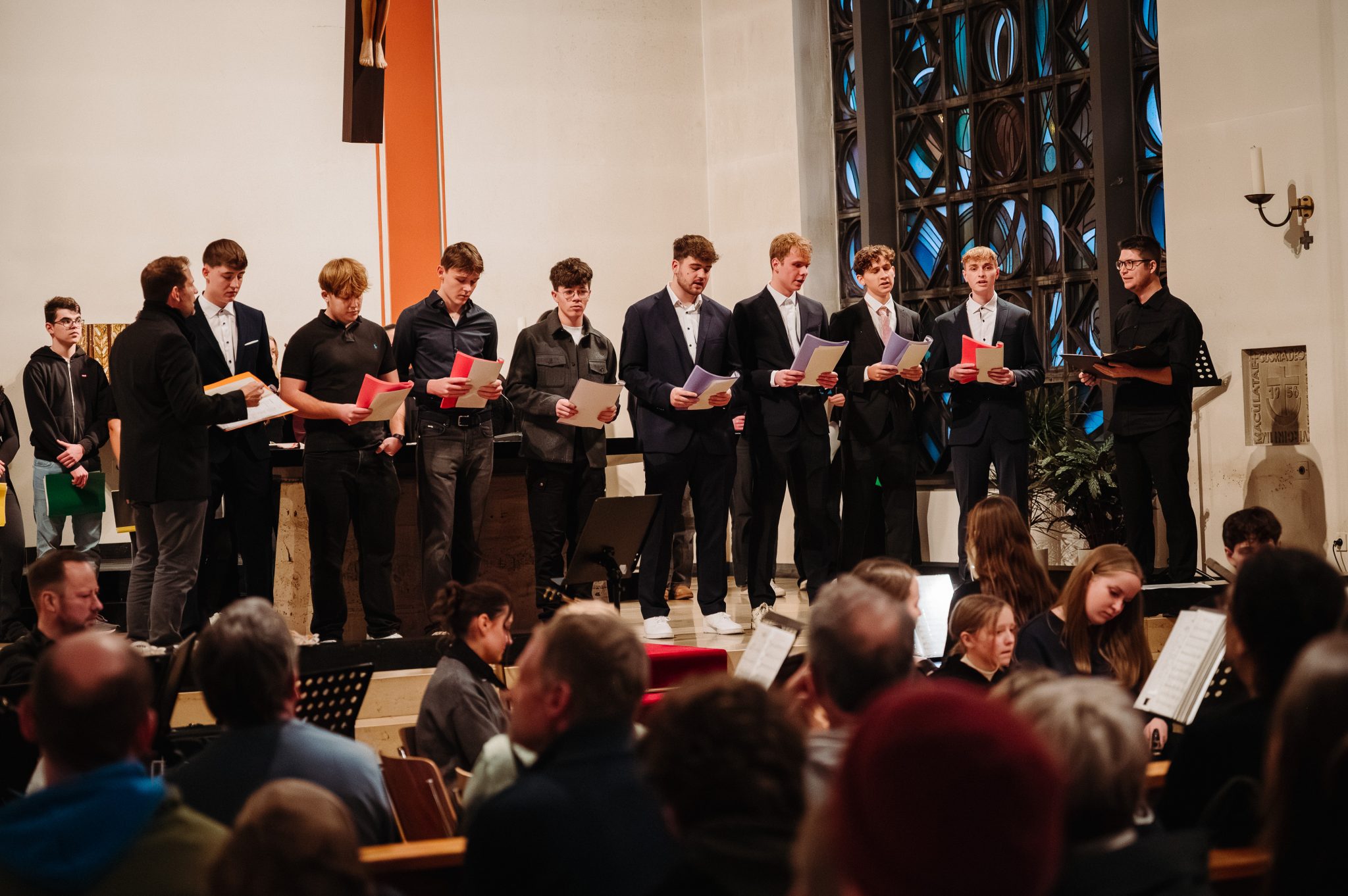 Zwischen den musikalischen Beiträgen führte Anton aus der 8c charmant durch das Programm und erzählte humorvolle Anekdoten zum Motto „Umzug in die Weihnachtszeit“. Mit jedem Programmpunkt wurde deutlicher, wie viel Vorbereitung und Engagement in diesem Konzert steckte. Neben großem musikalischem Talent zeigten alle Beteiligten vor allem eines: ein starkes Gemeinschaftsgefühl. Dies wurde auch durch den Lehrerchor und „Knabenchor“ sichtbar – letzterer bestehend aus Schülern, die bereits im Frühjahr ihr Abitur gemacht haben und dennoch dem FSG weiterhin verbunden bleiben. Ein weiterer Höhepunkt war das Stück „Nella Fantasia“, das unsere drei Musiklehrkräfte mit Gesang und ihren Blasinstrumenten – Posaune, Trompete und Querflöte – eindrucksvoll interpretierten.