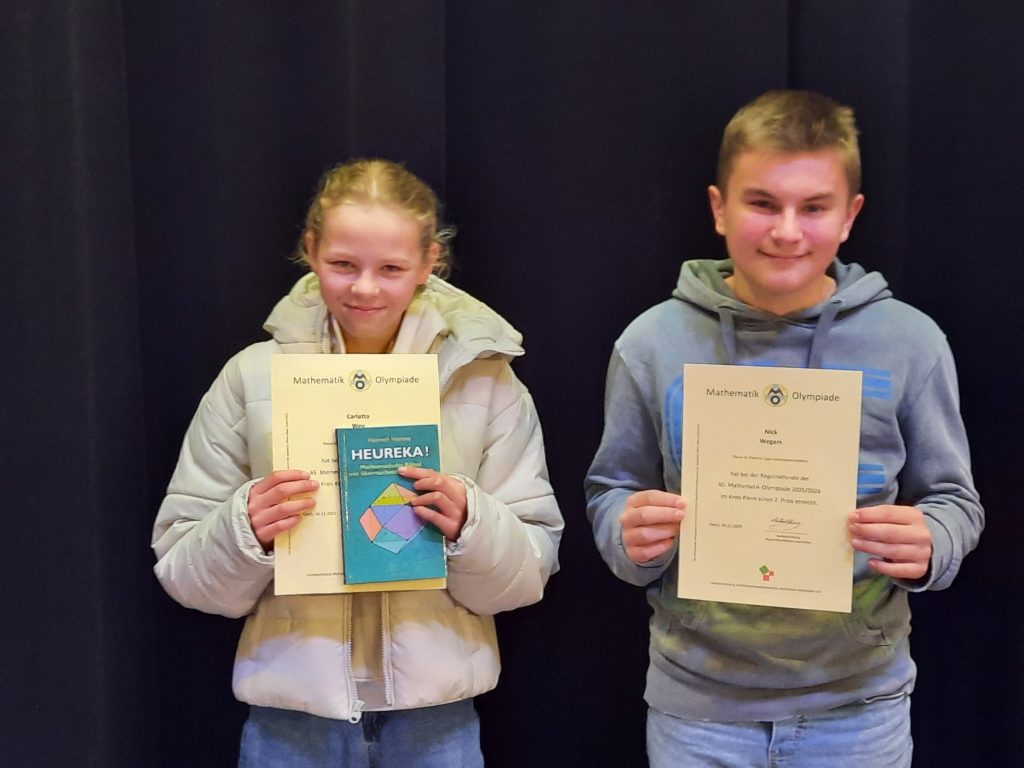 Bei der Regionalrunde der Mathematikolympiade im Kreis Kleve zeigten in diesem Jahr Carlotta Wey (6b) und Nick Wegers (8a) herausragende Leistungen. Beide erzielten einen 2. Preis und wurden im Rahmen einer feierlichen Siegerehrung am Collegium Augustinianum Gaesdonck für ihr mathematisches Geschick beim Lösen der anspruchsvollen Aufgaben ausgezeichnet.