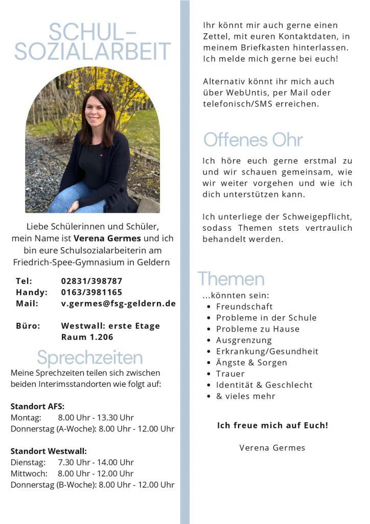 ab sofort übernimmt Frau Verena Germes die Vertretung als Schulsozialarbeiterin für Coralie Flaswinkel (siehe Steckbrief unten).
