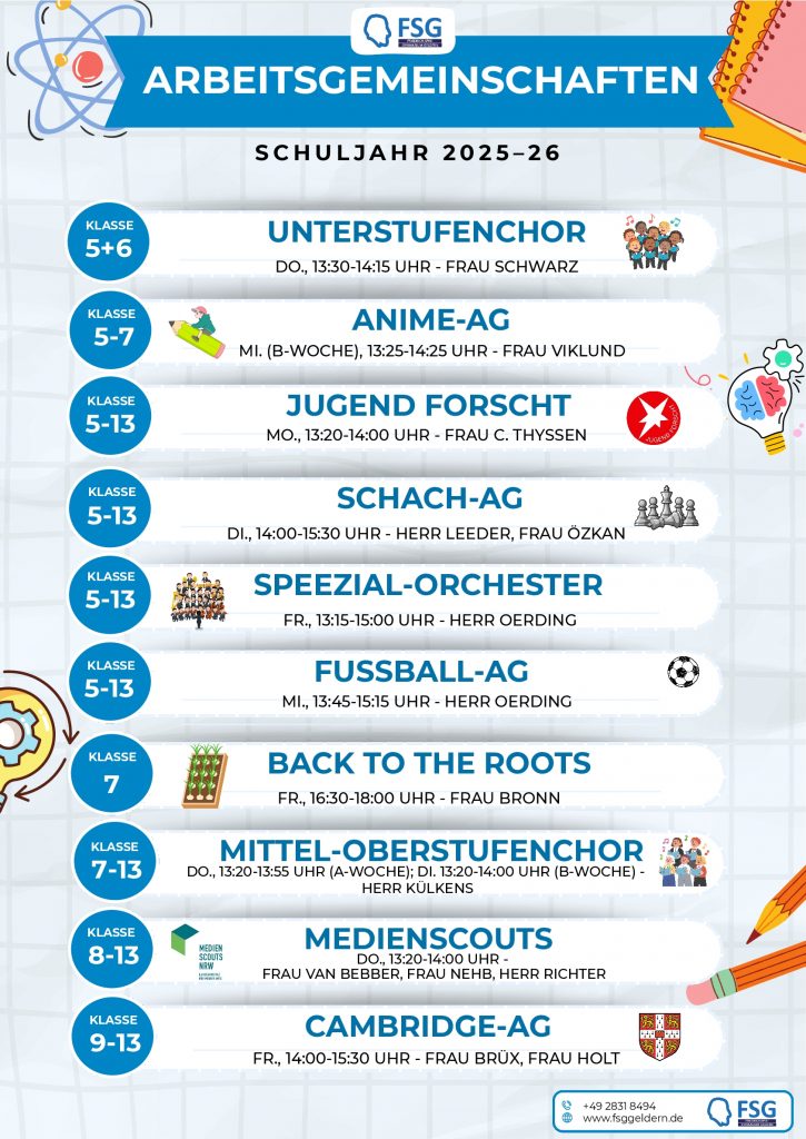 Im 2. Halbjahr des Schuljahres 2025/26 bieten wir bei uns am FSG folgende AGs an: